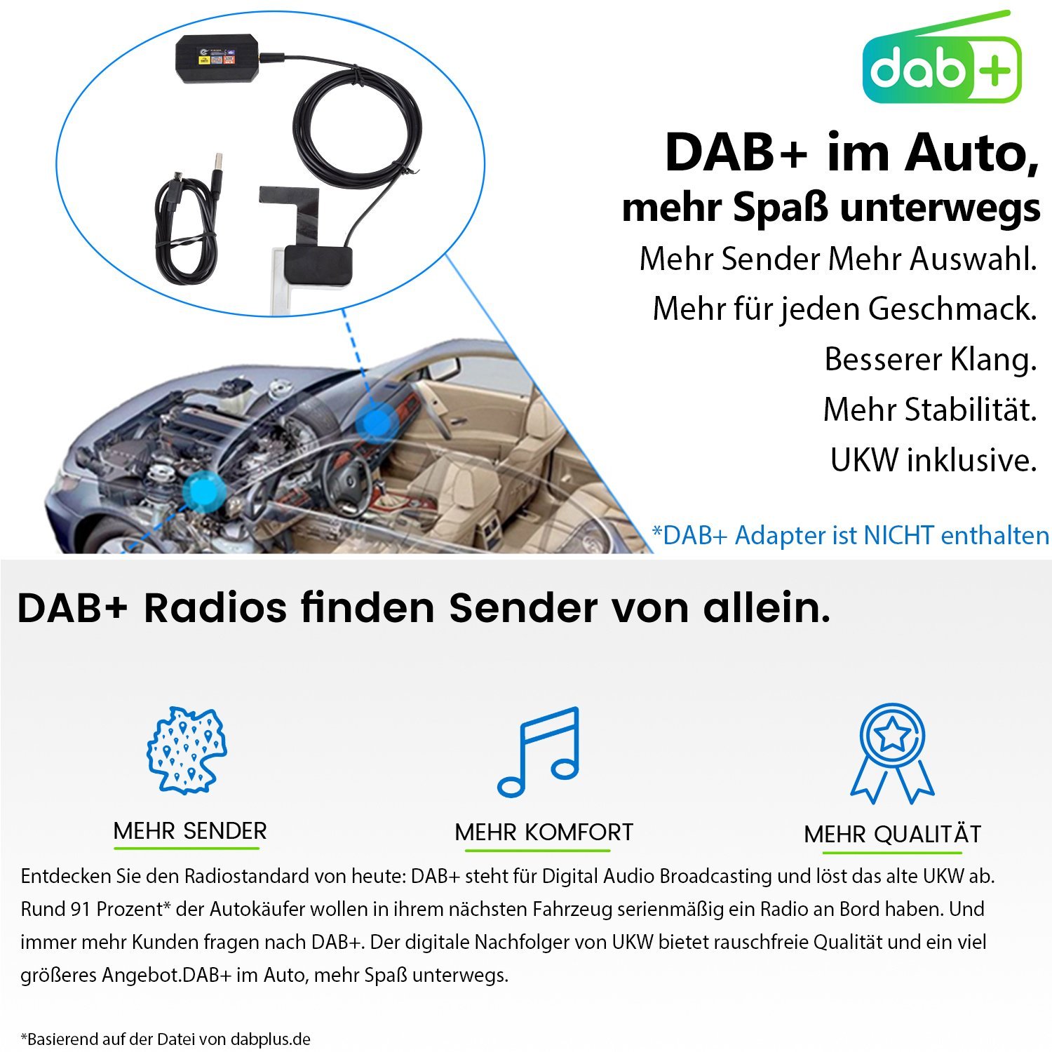 Entdecken Sie den Radiostandard von heute: DAB+ steht für Digital Audio Broadcasting und löst das alte UKW ab. Rund 91 Prozent der Autokäufer wollen in ihrem nächsten Fahrzeug serienmäßig ein Radio an Bord haben. Und immer mehr Kunden fragen nach DAB+. Der digitale Nachfolger von UKW bietet rauschfreie Qualität und ein viel größeres.